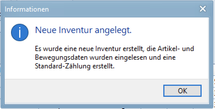 Es werden alle aktuellen Artikel- und Bewegungsdaten für die Bearbeitung aufbereitet. Dies kann einen Moment dauern. Sobald die Datenaufbereitung abgeschlossen ist, erhalten Sie eine Meldung, dass alle Daten eingelesen wurden und zur Erfassung der Zählung eine Standard-Zählung angelegt wurde.