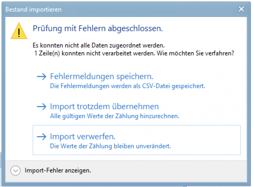 Durch Klick auf "Import trotzdem übernehmen" werden die Werte wie oben beschrieben in die Liste übernommen und gegebenenfalls zu bestehenden Werten hinzugerechnet. Wenn Sie sich für "Import verwerfen" entscheiden, wird der Import verworfen und die IST-Bestände bleiben unverändert.