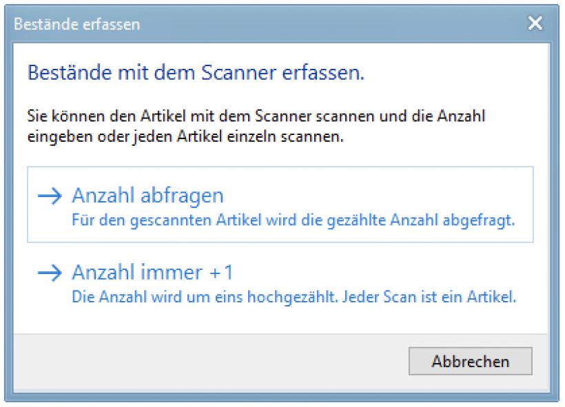 Um den Scan-Vorgang zu starten, klicken Sie auf die Schaltfläche "Scannen" (Bereich C). Es erscheint eine Abfrage, in welchem Modus Sie die Bestände erfassen wollen.