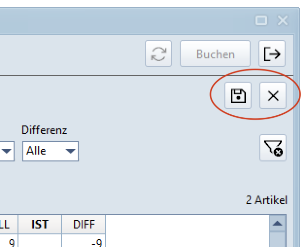 - DIFF: Die Spalte enhält die Abweichung des IST-Bestands zum SOLL-Bestand. Ein Wert kleiner als Null bedeutet, dass Artikel fehlen. Ein Wert über Null heißt, dass mehr Artikel vorhanden sind. Eine Null bedeutet, dass SOLL- und IST-Bestand übereinstimmen.