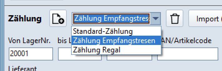 Im Bereich C können Zählungen hinzugefügt oder gelöscht werden sowie der Import vom MDE-Gerät oder die Zählung mit dem Barcode-Scanner gestartet werden.