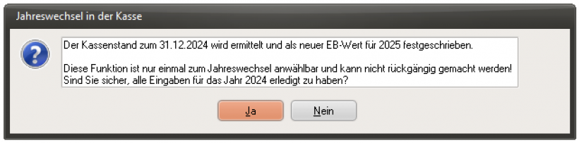 Bevor Sie im neuen Jahr weiterarbeiten können, müssen Sie einen Jahreswechsel vornehmen. Wählen Sie dafür aus dem Menü "Kasse> Jahreswechsel Kassenstand übernehmen". Es erscheint ein Bestätigungsdialog.